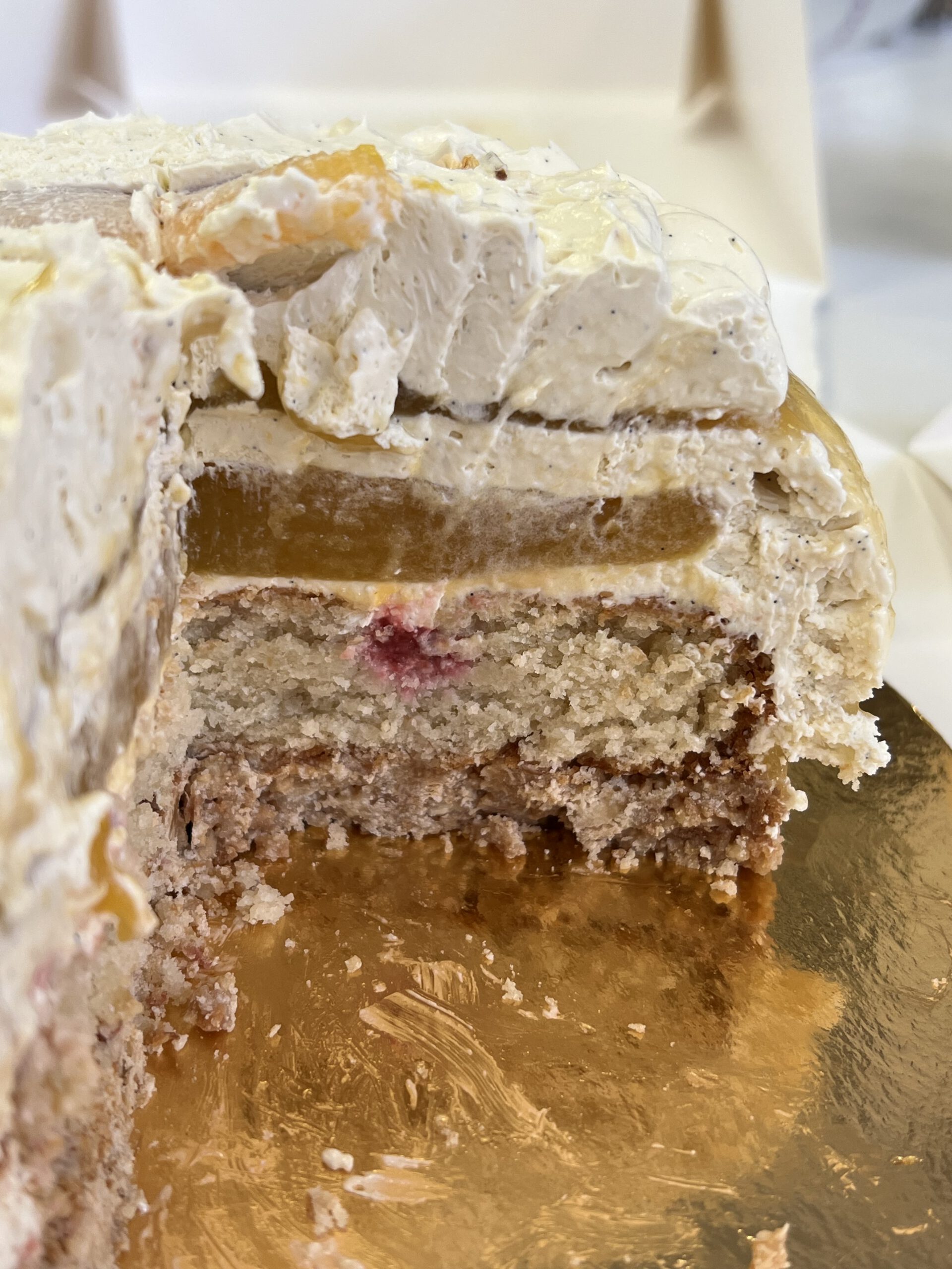 Recette de glaçage de la crĂ©ation « Abricadamia » de Matteo Deiana (Giardino), prĂ©sente dans le magazine Fou de PĂątisserie numĂ©ro 71 et adaptĂ©e avec de la purĂ©e de pĂȘches.